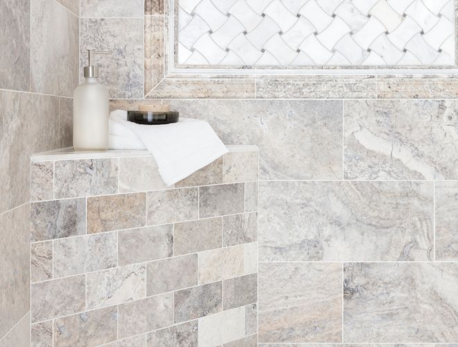 Silver Travertine Shower : Whispers of silver, gray, walnut, and cream swirl in harmony in our silver travertine tile creating an elegant palette that evokes luxury bring inspiring style to your space with stunning silver travertine.